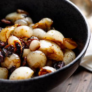- Heat the oil in a large skillet. Add the onions, season with salt and pepper and sauté, stirring only occasionally, for 8 minutes or so until they are caramelized in spots, and starting to soften Add the dried fruit with the cider, vinegar, and sugar. Bring to a simmer and cook until the sauce thickens and glazes the onions, about 4 minutes. Serve hot.