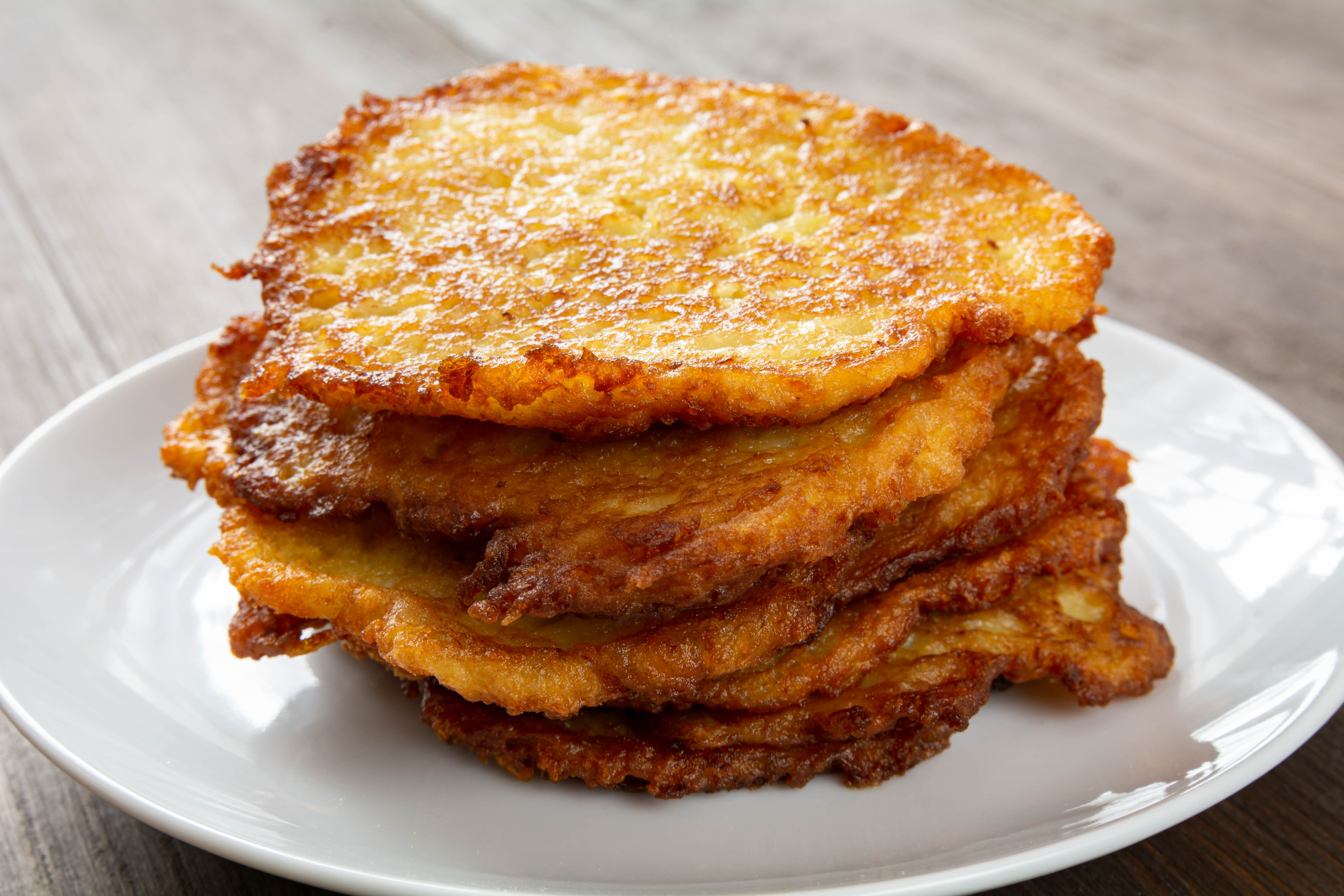 Fry the potato pancakes until golden brown on each side (about 3-4 minutes per side). Then use a spatula to remove the pancakes from the skillet and drain on paper towels. Once drained, place the pancakes on the warm baking sheets in the oven to keep them warm while you finish frying the rest of the pancakes in batches.