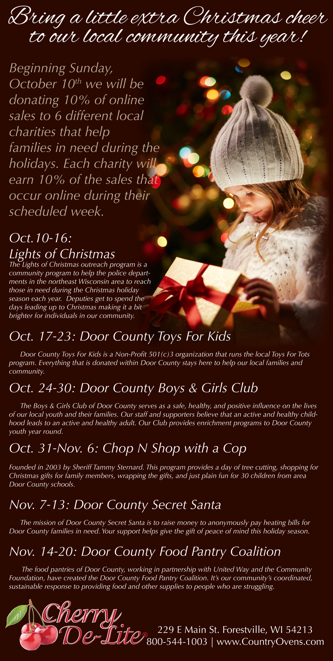 We don't normally start our holiday promotions this early however with the uncertainty of the shipping industry and lack of retail items, we thought it would be best to help those in need if we can. This year may be a little more difficult than normal for families across the country, we are encouraging our customers to shop early for your holiday gifts and help us support these wonderful organizations that do so much for those for Door County families.